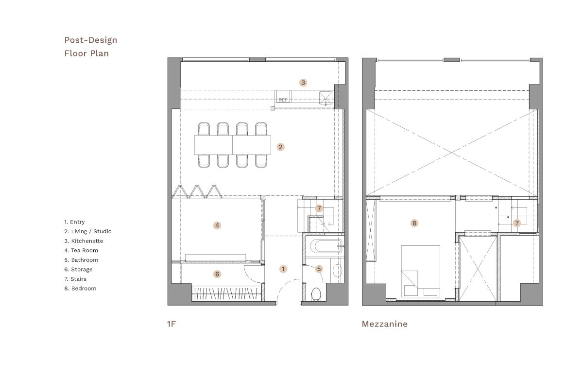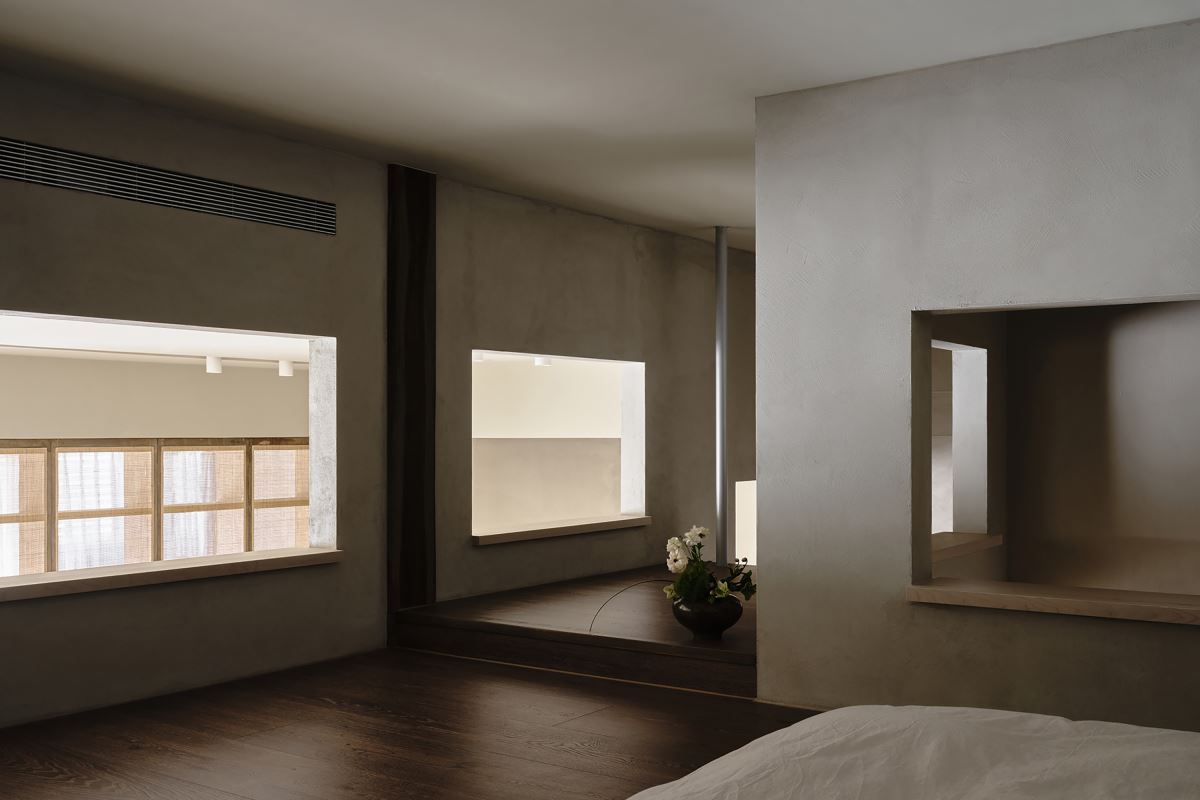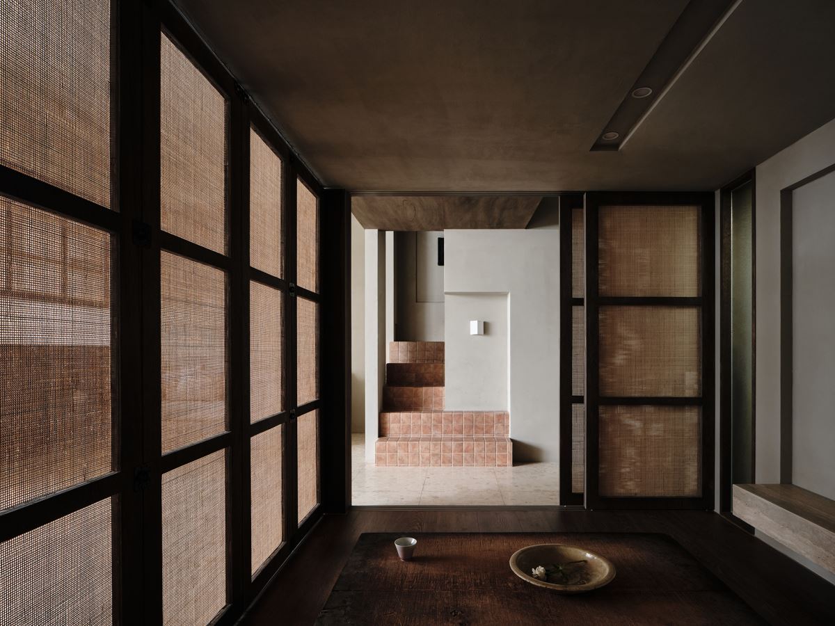 作品名稱 /House FC作品說明 /以「一步一刻一景」作為設計概念主軸,在空間中的每一步、每一刻和每一景都賦予獨特的詩意。 整個空間以暗色調鋪陳,再用挑高空间與大面積開窗,纳入更多自然光與室外景色。牆面開口與梁柱錯落捕捉四時光影變化,使窗外樹景與室內景色堆疊,各個角落自成端景。 不同時刻、不同位置帶來的心境轉換豐富了屋主的居住生活體驗,使得生活、工作、藝術、得以自成一格,亦和諧共存。 「一步」 進入空間時,突出的一階台階,捉住第一縷視綫,帶有年代感的手作紅磚覆蓋樓梯的立面與踏面,並與刻意保留的原有石材地磚與藤編折門相呼應,在視覺與觸覺的連貫統一中,將視綫引向樓梯旁的開口,被框住的部分樓梯,變換為聚攏目光的藝術壁龕。與此同時,步步登階而上,空間與高度的變化也透過這開口體現。最終在靜止的空間中,人的移動與流轉的視綫帶來了感官體驗的變化。 「一刻」 茶室座落於住宅的核心,充分傳達屋主對於「寧靜」的追尋與探索。灰泥牆面、深色實木地板讓空間沈穩凝練。四周以藤編折門圍繞,取代了實體牆面。籐編的穿透性引入光影,開闔之間,心境得以隨著時刻變化,既可以是好友相聚、閒適品茗的開闊空間,抑或是獨處內省、體會茶道的寂靜一隅。我們為屋主設計一處興之所至,心之所安的靈活空间。沏上一壺好茶後,交流、創作、冥想、沉思,讓心神弛放的是入口的茶香,也是無拘無束的畅快。 「一景」 閣樓臥室牆面一致的淺灰泥色調增添柔和,對窗的大面積開口則是屋主藏品陳列的畫框,同時,也可以留白任由窗外綠影鋪滿空間,讓閣樓充滿了美好的景緻和詩意。 在這個居所中,屋主可以在時光的微弱流轉和步伐的輕躍交織,與自然和諧共存,沉澱心靈,尋找靈感來源。