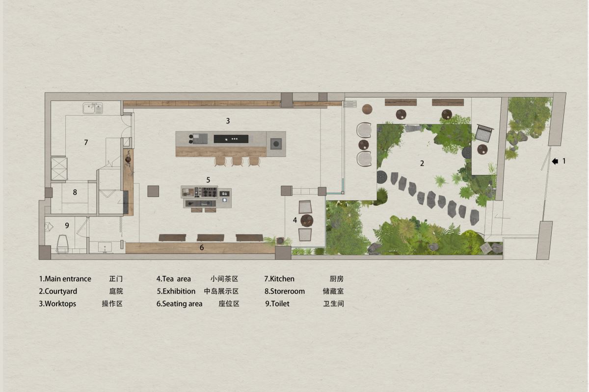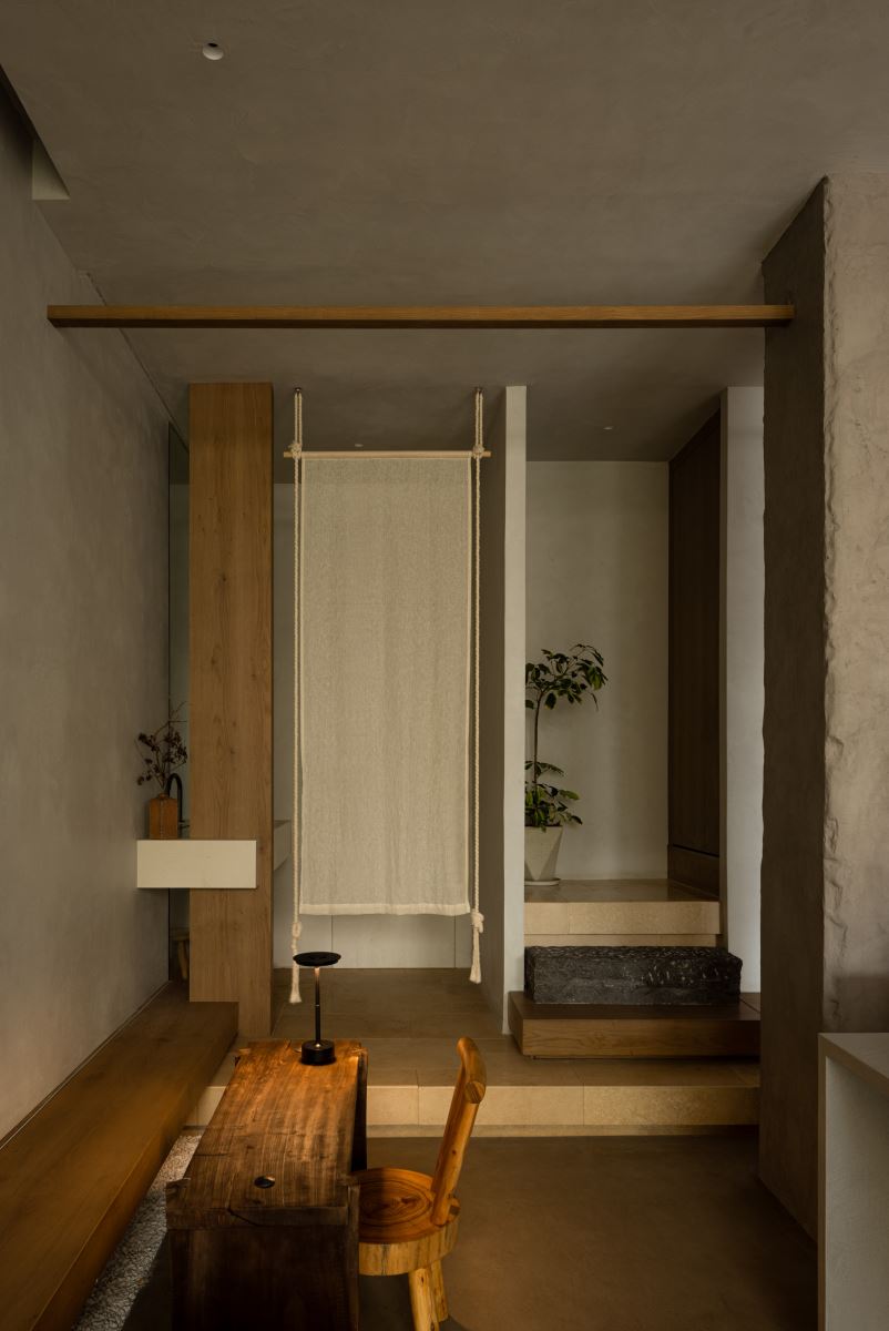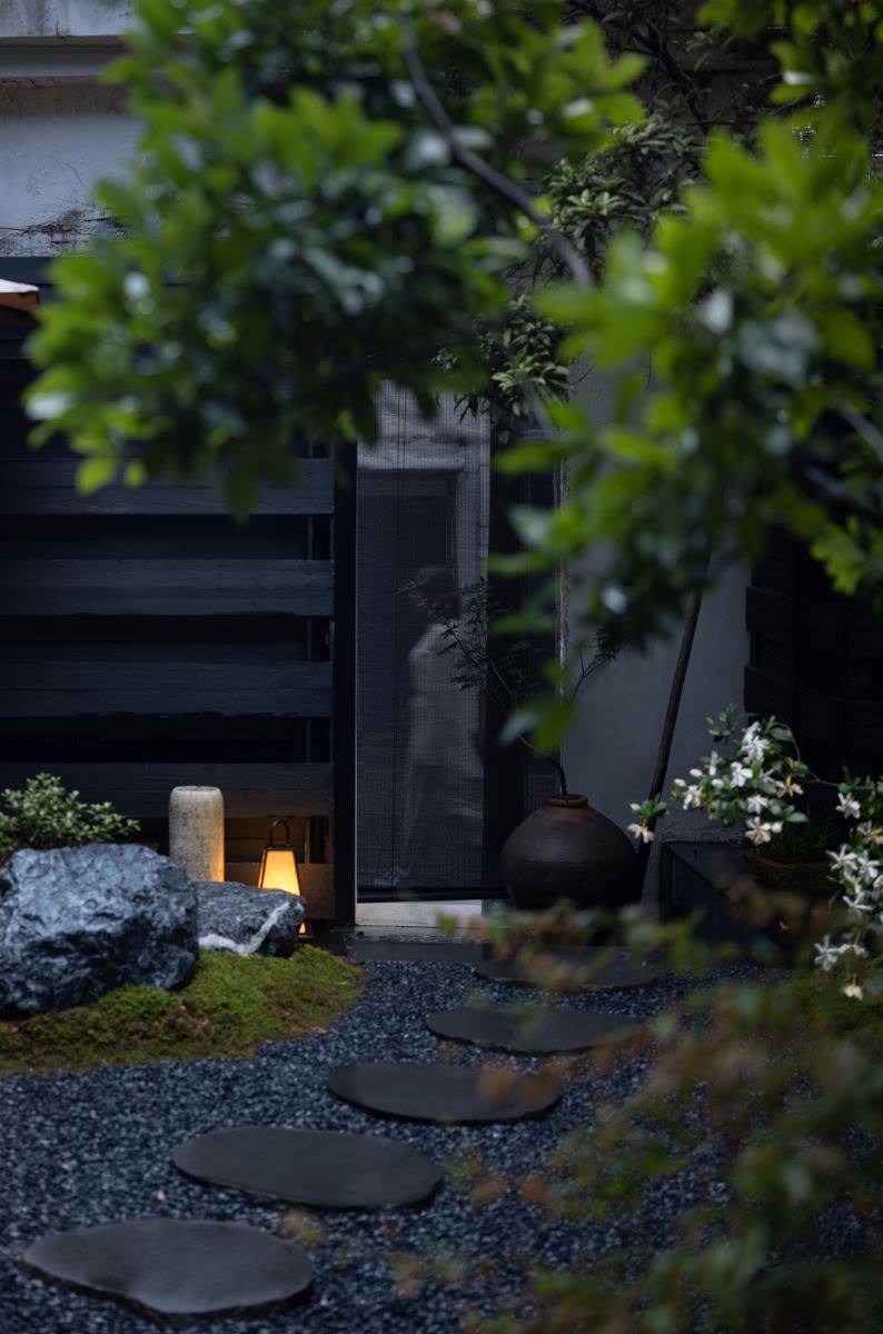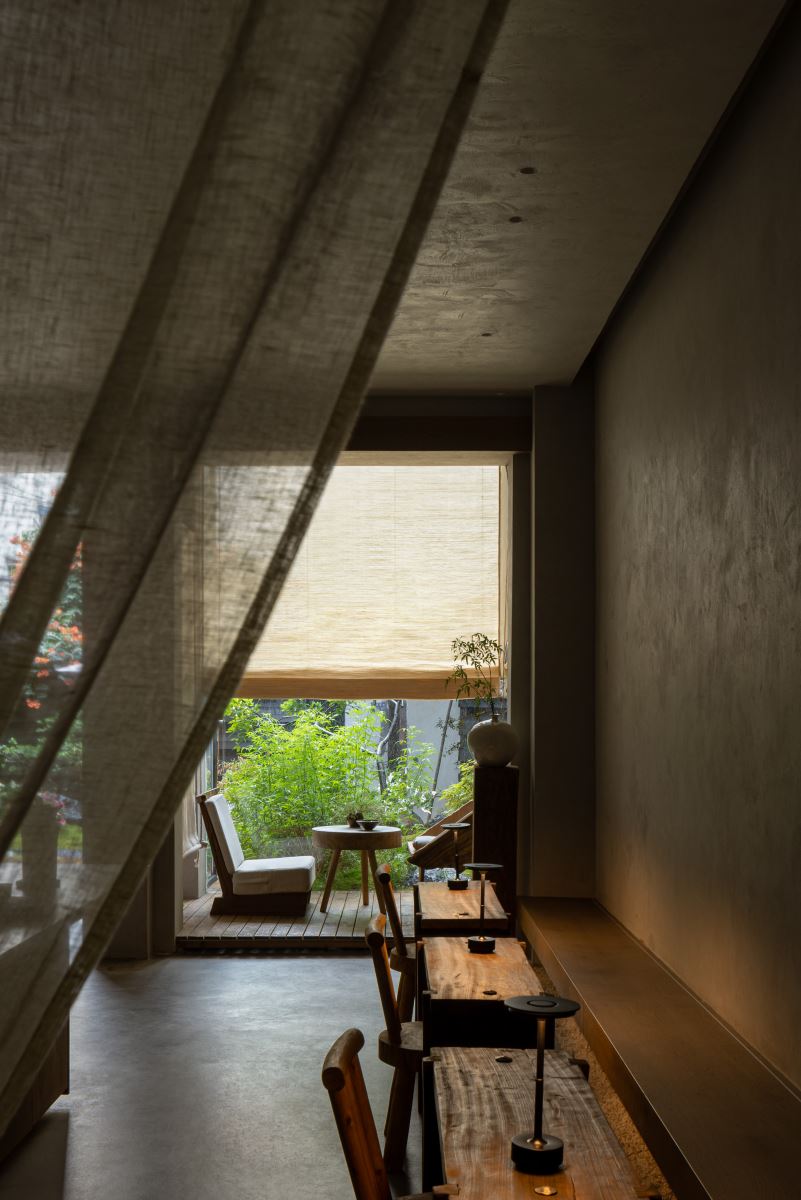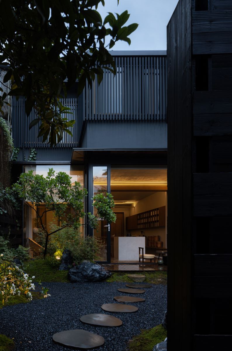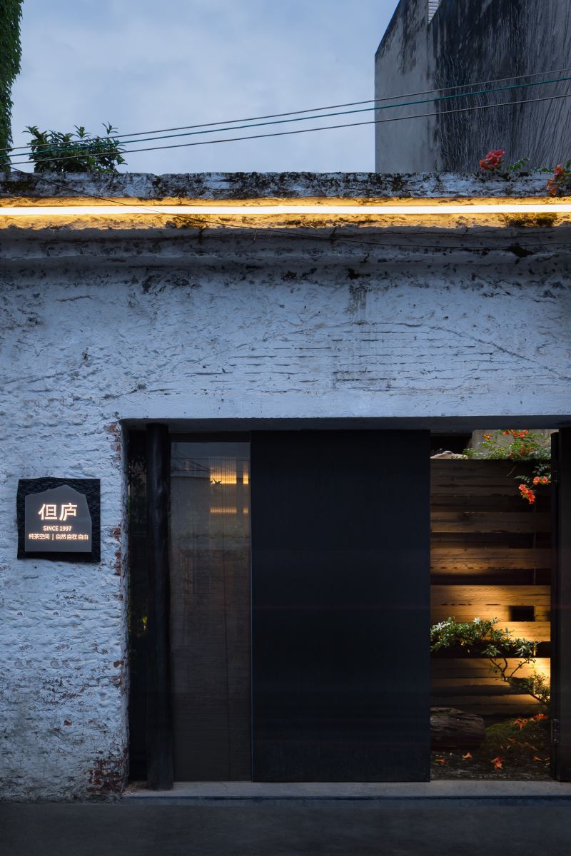 作品說明 /在溫州,在老城區,在72條老巷之中,我們設計了這樣一間茶廬:依託巷弄老宅將古樸與自然融合,去發揮建築的歷史韻味和茶器茶物的性格特色,讓文化底蘊和寧靜優雅去充盈這個茶空間。 這是一座帶有庭院的二層老宅,我們有意保留了老宅的原有結構,將老式合院的門頭、磚牆通過修繕和設計,讓這些元素煥發新的生命力。依託黑色碳化木柵欄、鋁合金格柵,將老宅的不融洽一面適度“收藏”。用大落地門窗打開原始落地房的採光格局,儘量拾光入戶,使室內明亮和寧靜。新鋪設了戶外木,也讓院落與室內空間互通。合圍式的院落佈局和園藝設計手法,烘托出古樸和神秘,自然與輕鬆之感。 在室內空間佈局上,一樓作為茶空間,二樓為業主自住使用。因此,我們隱藏了樓梯,並儘量減少其對空間的佔用。一字型的多功能超長茶台貫穿整個空間,讓客人能夠直觀面對茶藝師的沖泡、分杯、講解,亦如板前料理,將雙方的溝通距離無限拉近,增強品茗體驗。充足的茶器展示櫃,滿足了業主對於分享美好之物的期望,也讓茶藝的製作更具儀式感。 一個通透的茶憩小包間、一個緊湊而又舒適的卡座、一個可移動的展示中島台,一個多功能的超長茶台,共同構成了小而美,清新而自然的室內佈局。業主精心收來的家具和裝飾物與老宅的粗糙和原始相呼應。 在但廬,設計不僅僅是形式的呈現,更是品茶過程中的一部分。我們將舒適、雅致與文化融合,將茶道與空間美學結合,呈現獨特的茶文化體驗。
